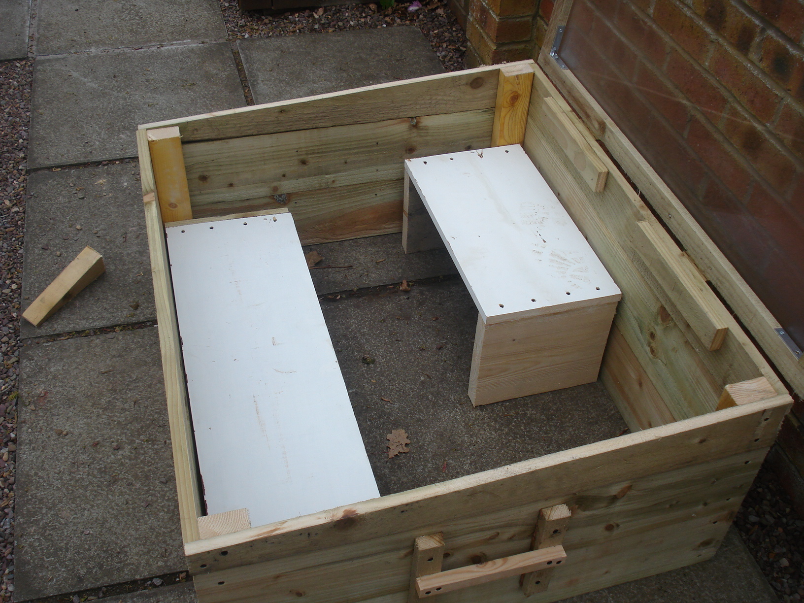 The lid is attached with hinges and two of our old wardrobe door knobs have been recycled. Note the bespoke carrying handles at the side!