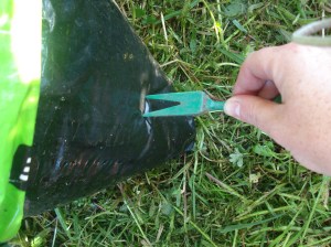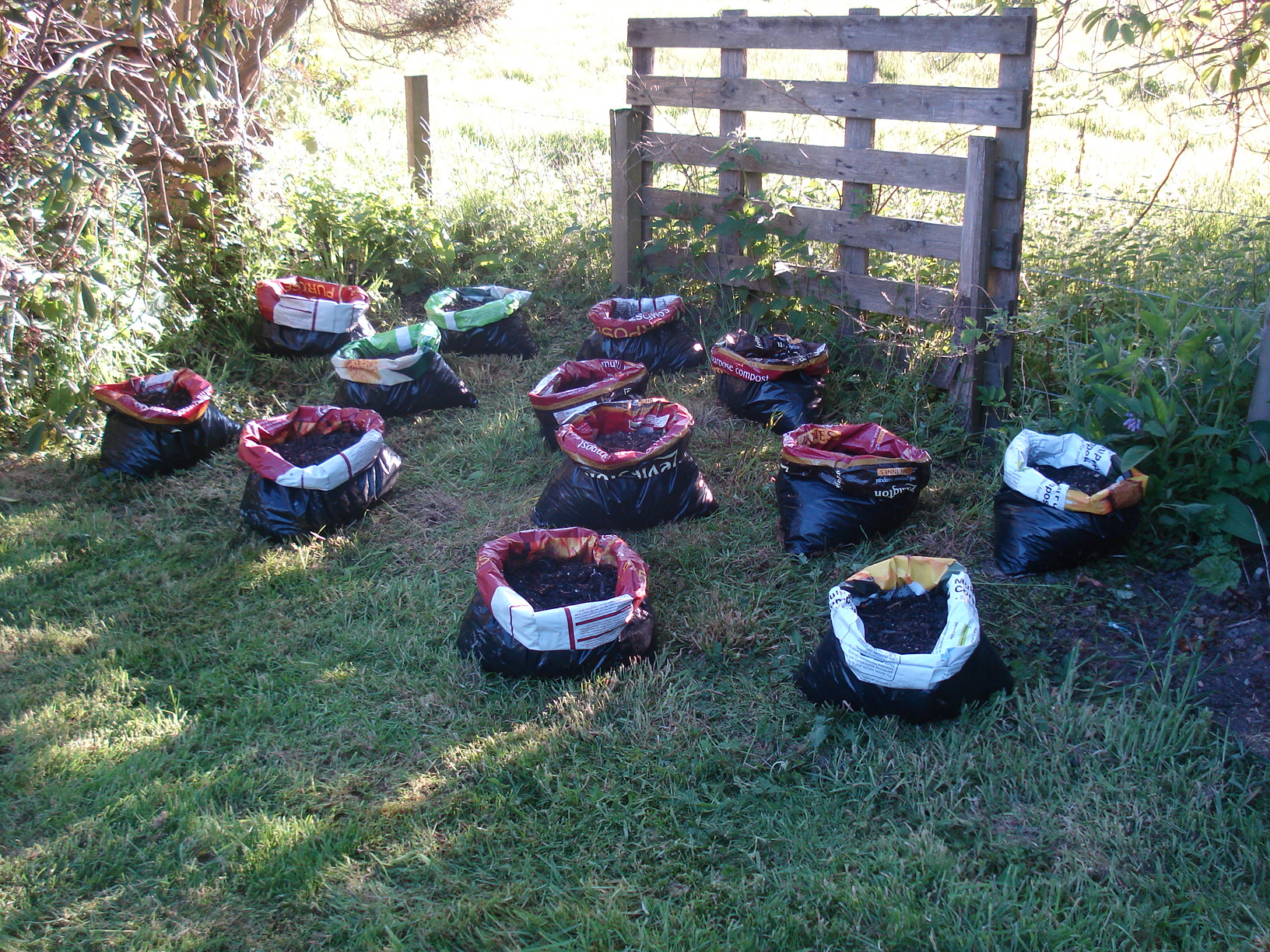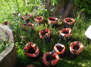 We saved empty compost bags which are the ideal size. They were all washed in a big bucket filled with water, bleach and washing up liquid to kill the bugs. Then they were left in the sun to dry.