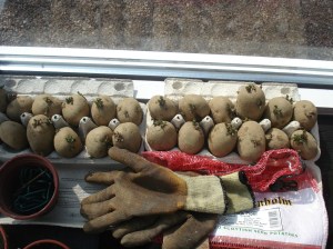 Even though we were late planting them they had been sitting in the greenhouse happily chitting away. For the uninitiated (like I was 3 years ago!) chitting involves sitting the tubers in a box, such as an old egg box, with the growing end facing upwards – recognisable by the cluster of tiny buds (“eyes”) on it. When the shoots are about an inch long they are ready for planting. This gives them a head start, although many people say you don’t need to chit maincrop potatoes because they have a longer growing season!